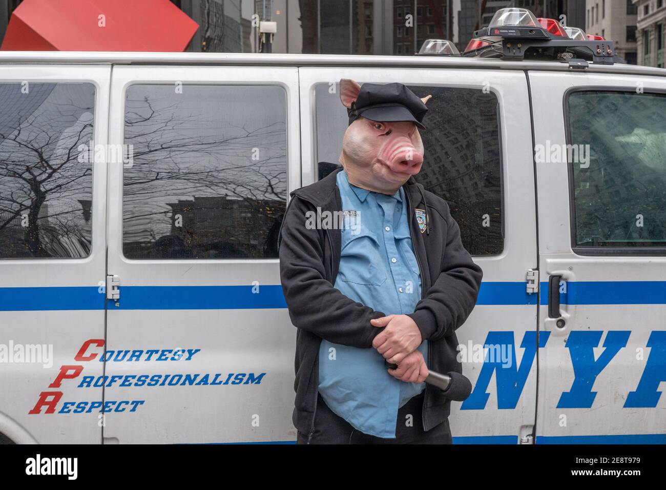 New York United States 31st Jan 2021 A Man Wearing A Pig Mask And Police Uniform Poses Against A Nypd Car During The Re Occupy Wall Street Protest Over The Gamestop Stock Controversy